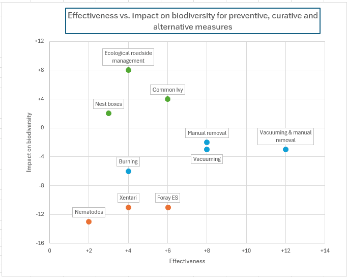 Regarding the various strategies used—combinations of preventive, curative, and/or alternative measures—one important finding is worth noting: the municipalities that use only curative measures (such as vacuuming) spend only 45% of the budget of those who use both preventive and curative measures. This means that, regardless of the unit price and practical difficulties, it would be more efficient to invest in curative measures than in the more damaging preventive measures.